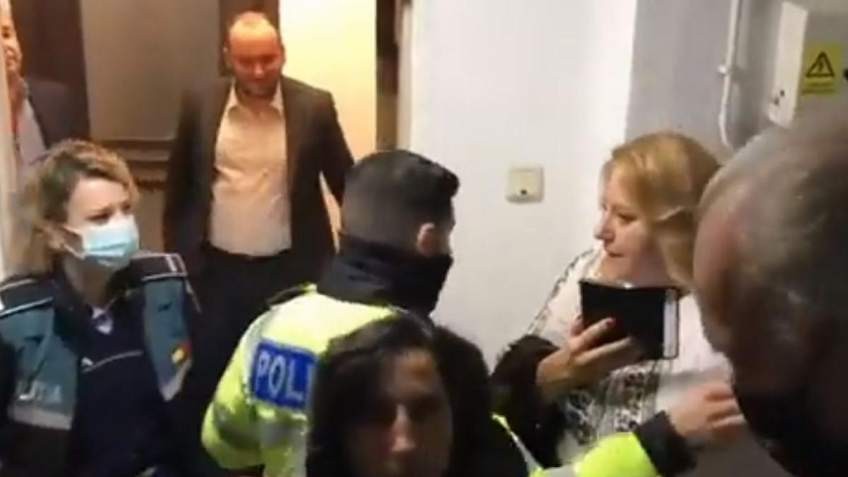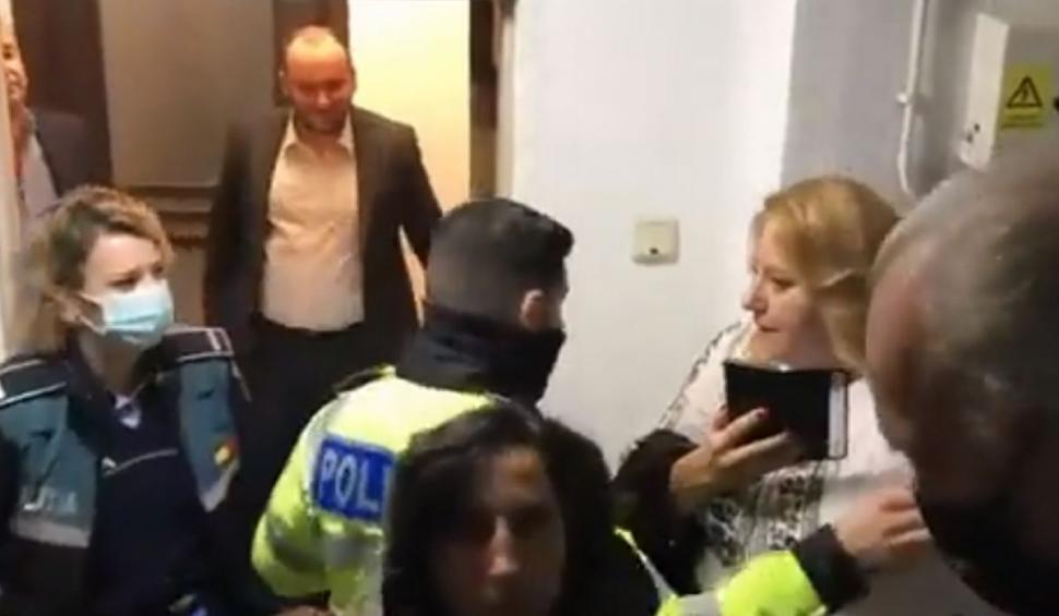„Trei poliţişti au sărit pe soţul meu şi l-au imobilizat şi l-au dat cu capul de uşă şi i-au băgat mâna în gât", a declarat Diana Șoșoacă.