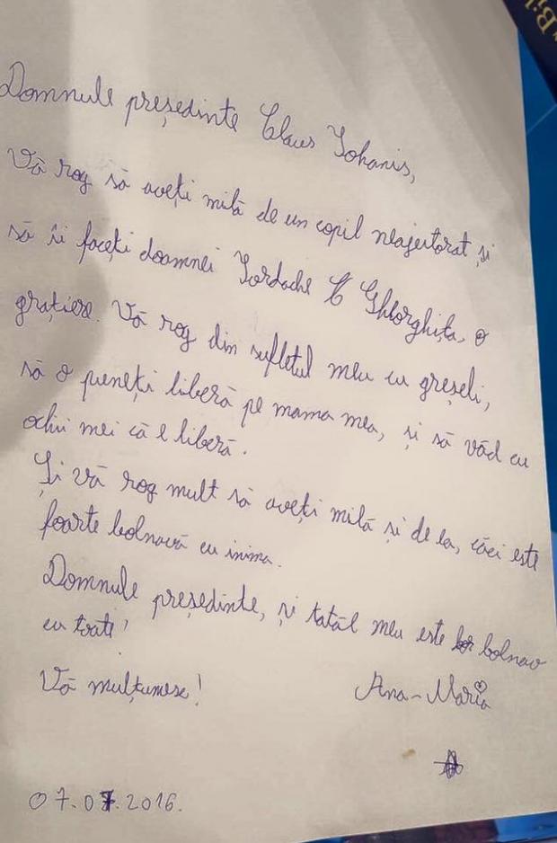 ”Dacă un om mare, cum ar fi domnul președinte Iohannis, i-ar da o grațiere (mamei - n.r.), aș vrea să o văd de ziua mea acasă. Să aibă milă de mine, de un copil fără ajutor și să-i dea grațiere, să o văd în afara pușcăriei”, i-a transmis fetița, președintelui Klaus Iohannis.