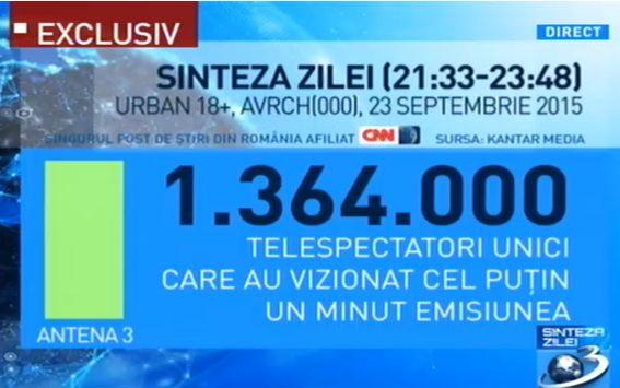 Astfel, "Sinteza zilei" a fost lider de audienţă pe întreaga piaţă, ieri seară, 1.364.000 de telespectatori unici vizionând cel puţin un minut emisiunea.
