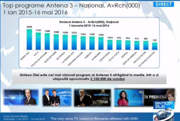 Astfel, potrivit evaluarilor Kantar Media, în perioada 1 ianuarie 2015 - 16 mai 2016, la nivel național, 4.355.00 de telespectatori au urmărit în medie timp de cel puțin un minut, programele postului Antena 3, pe parcursul întregii zile.