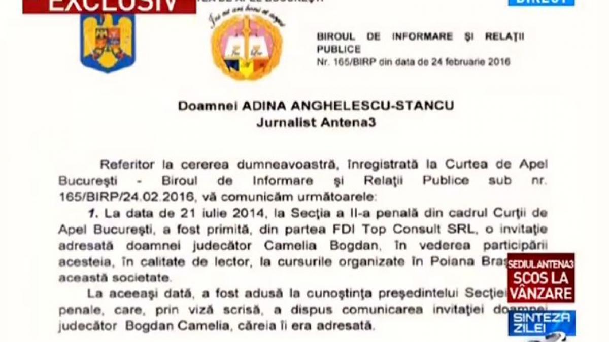 În răspunsul dat Adinei Anghelescu, Curtea de Apel București afirmă că la Sectia a IIa Penală a fost primită din partea FDI Top Consult SRL o invitație adresată Cameliei Bogdan, in vederea participării acesteia în calitate de lector la cursurile organizate în Poiana Brașov.