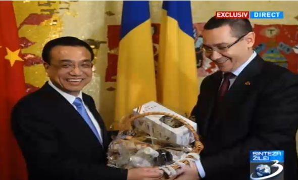 Întrebat ce i-a oferit el premierului chinez, Ponta a răspuns: "Eu i-am oferit cadou un uriaş coş de produse româneşti". "Şi doamnei Merkel tot produse ecologice îi dau, şi din colecţia MAE am trimis o copie după sabia lui Ştefan cel Mare", a mai completat Victor Ponta.