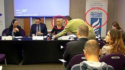 Răzvan Savaliuc, de la Lumea Justiţiei, a prezentat miercuri seară, la "Sinteza zilei", o fotografie făcută în timpul unei conferinţe de presă organizată de Freedom House şi la care a participat judecătoarea Camelia Bogdan, de la Curtea de Apel Bucureşti.