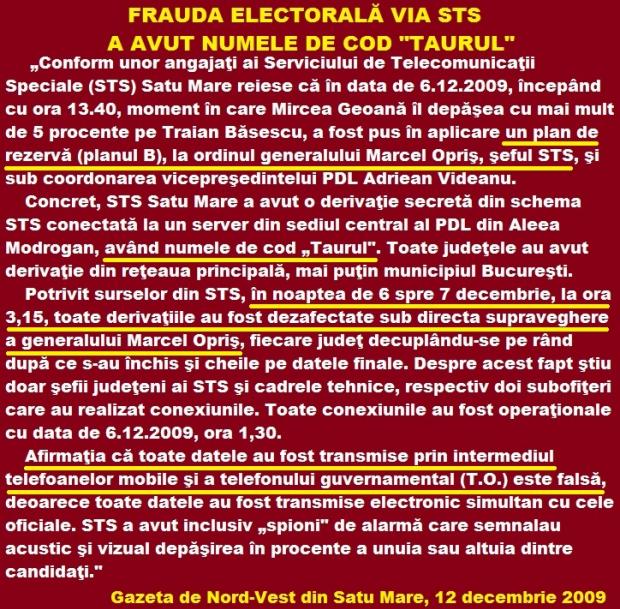 Jurnalistul Ovidiu Ohanesian publica, în 12 decembrie 2009 articolul intitulat „Frauda electorală via STS a avut numele de cod «Taurul»”.î