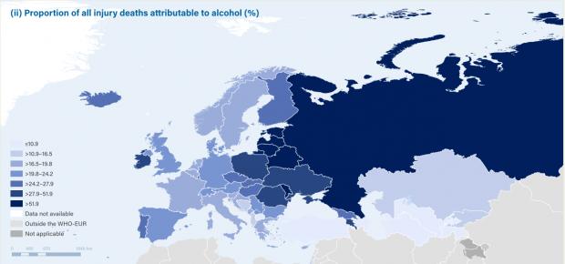 De exemplu, comparativ cu mai puțin de 20% în mare parte din Europa de Vest și de Sud, decesele ce pot fi atribuite consumului de alcool în țările din Europa de Est depășesc 60% din totalul deceselor legate de răniri și violență.