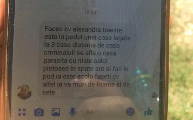 „Faceţi ceva, Alexandra trăieşte, este în podul unei case, legată, la trei case distanţă de casa criminalului, cu nişte sălcii pletoase în spatale casei şi ea va muri de foame şi de sete!“, este mesajul primit de Poliţie miercuri la prânz.