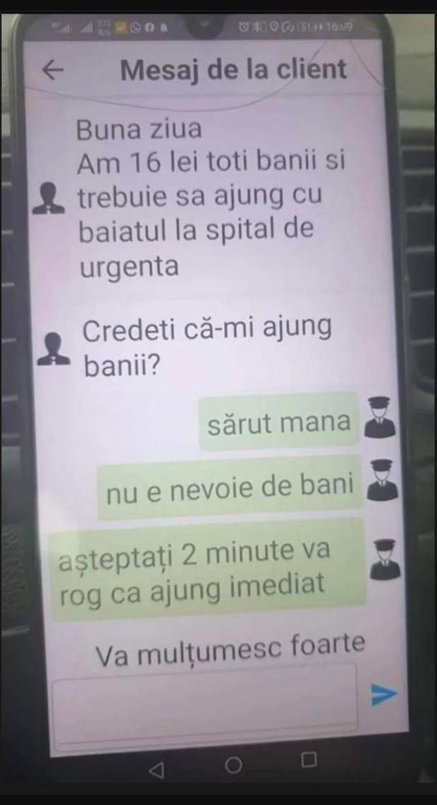 "Sărut mâna. Nu e nevoie de bani. Așteptați 2 minute, vă rog, că ajung imediat", i-a răspuns șoferul.