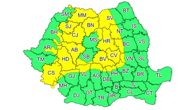 Judeţele care se vor afla sub avertizare Cod galben sunt: Alba, Argeş, Arad, Bacău, Bihor, Bistriţa-Năsăud, Braşov, Buzău, Cluj, Caraş-Severin, Covasna, Dâmboviţa, Gorj, Hunedoara, Harghita, Mehedinţi, Maramureş, Mureş, Neamţ, Prahova, Sibiu, Sălaj, Satu Mare, Suceava, Timiş, Vâlcea şi Vrancea.