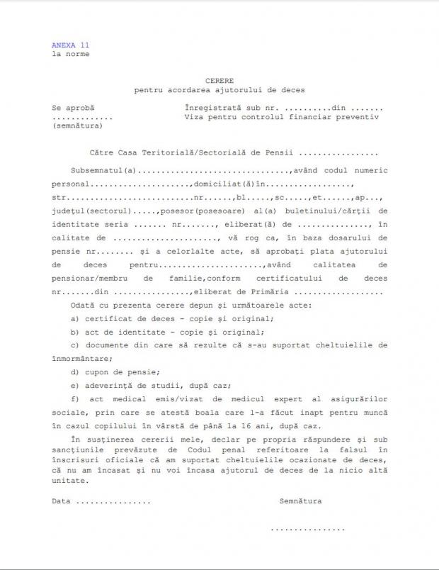 Modelul de cerere pentru ajutorul de deces o puteți găsi aici.