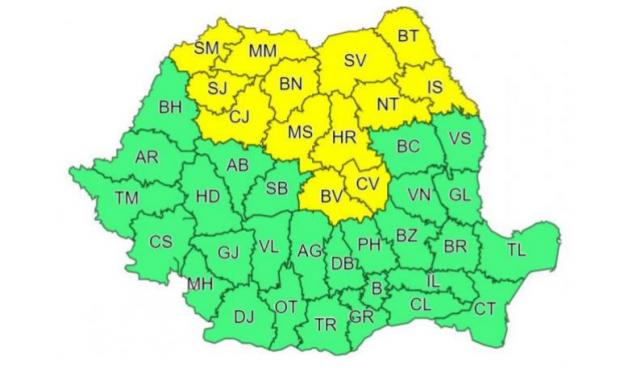 Alerta vizează județele Satu Mare, Maramureș, Sălaj, Suceava, Bistrița-Năsăud, Neamț, Harghita, Mureș, Brașov, Covasna, Cluj, Botoșani și Iași.