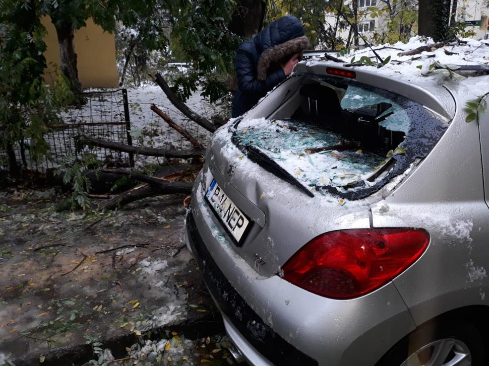 O mașină a fost distrusă, după ce un copac a căzut peste o mașină. Arborele s-a rupt și a căzut, distrugând luneta, caroseria este îndoită.