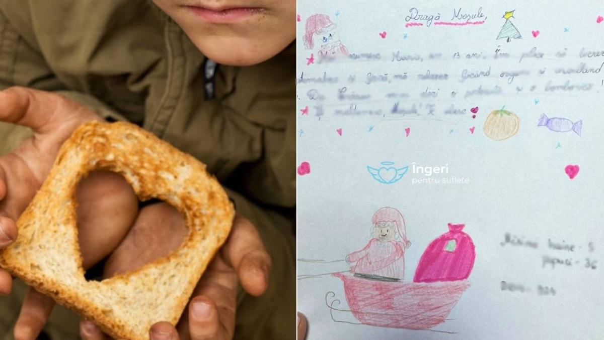 "Mi-aș dori de la tine, Moșule, napolitane și suc Tedi. Și lui mami, ulei pentru prăjit cartofi. Mulțumesc. Te iubesc, Moșule!”, a scris Amalia, o fetiță de 7 ani.