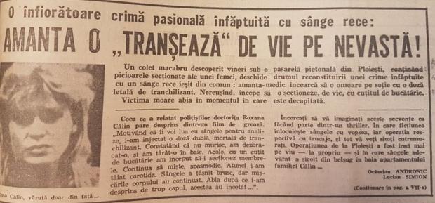La doar 35 de ani doctorița Roxan Călin, medic pediatru, intra în rândul marilor ucigași români ca autoare a celei mai şocante crime pasionale comise vreodată la noi. Cu un sadism atroce, ea a ucis-o pe soţia amantului ei, a tăiat-o în bucăţi şi a aruncat-o prin tot Ploieştiul. Crima e consideră de departe una dintre cele mai șocante crime comise vreodată în România.