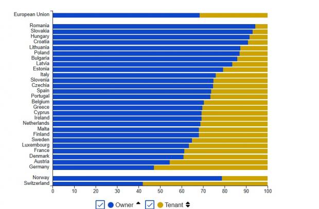 Cele mai mari ponderi ale proprietății au fost observate în România (94% din populație locuia într-o gospodărie aflată în proprietate privată), Slovacia (93%), Ungaria (92%) și Croația (91%).