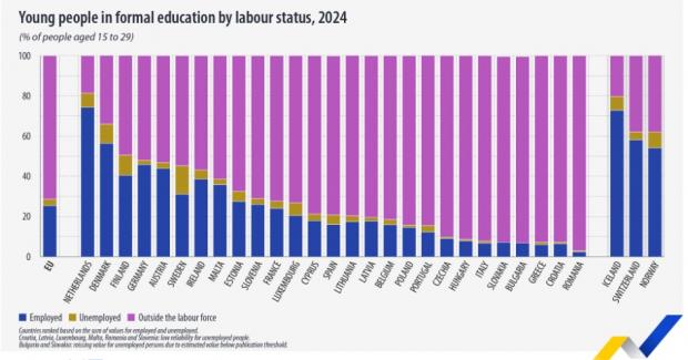 Olanda (74,3%), Danemarca (56,4%) și Germania (45,8%) au înregistrat cele mai mari ponderi ale tinerilor care lucrează și studiază simultan. În schimb, România (2,4%), Grecia (6,0%) și Croația (6,4%) au raportat cele mai mici ponderi dintre țările UE.