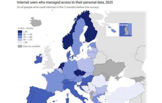 În 2025, 76,9% dintre utilizatorii de Internet din UE și-au protejat datele online, luând măsuri pentru a gestiona accesul la datele lor personale, o creștere de 3,7 puncte procentuale față de 2023 (73,2%).