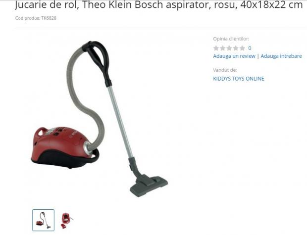 Nici prețul nu seamănă cu al unei jucării. De asemenea, la fel ca în cazul oricărui produs, există descrierea aspiratorului, cu caracteristicile și recomandările necesare vârstei, respectiv peste trei ani.