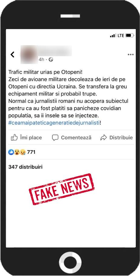 „Vă semnalăm o știre falsă care este distribuită pe rețelele de socializare. Informațiile din această postare nu au nicio legătură cu realitatea, titlul postării este: Trafic militar uriaș pe Otopeni. Reiterăm îndemnul de a vă informa din surse oficiale. Nu uiați, puterea stă în cei mulți. În lupta cu dezinformarea, puterea stă şi în fiecare dintre noi. Nu redistribuiţi informaţii fără o minimă verificare”, au scris pe Facebook reprezentanții MApN.