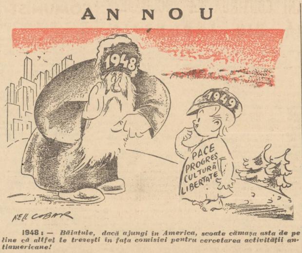 Moș Crăciun e făcut „băiat” de un tânăr impertinent („anul 1949”), care îi atrage atenția asupra culorii (roșii) a mantiei sale, aspect care i-ar putea provoca neplăceri „în America”.