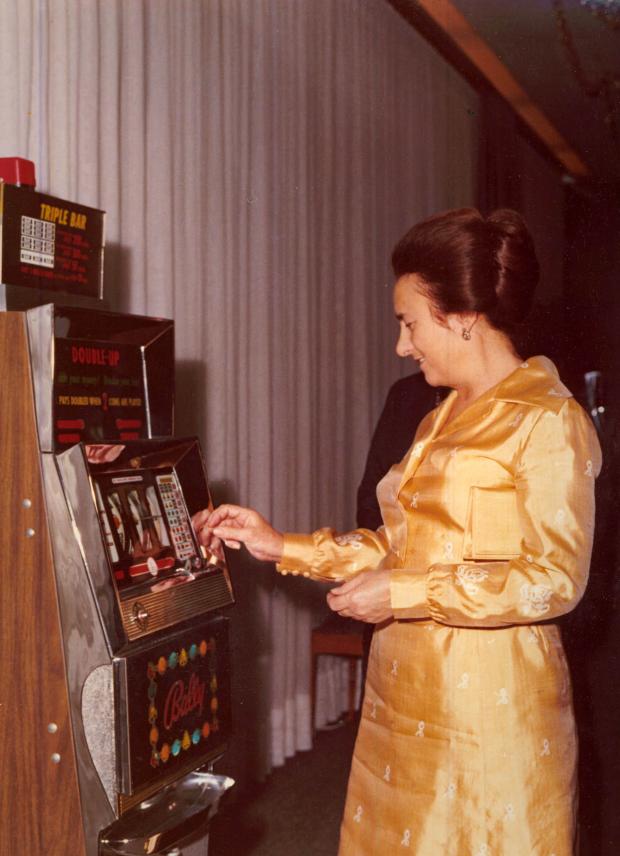 Elena Ceaușescu joacă păcănele la Revelionul din 1976. Sursa foto: Fototeca online a comunismului românesc, cota 015