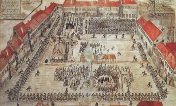 Centru al vechii cetăți, Piața Mare găzduia decapitări în public care au urmat după secolul al XVI-lea. Aici, ochii sinceri ai orașului puteau vedea Teatrul Lumii, în forma lui cea mai crudă. Primele crime din cetatea Sibiul au avut loc la jumătatea secolului XVI, după instalarea stâlpului infamiei. Dezertorii aveau parte de pedepse la fel de grele. În 1704, în Piața Mare sunt executați cinci muschetari dezertori. Aceștia au fost omorâți prin spintecare în patru. Alți șapte confrați de ai lor au fost spânzurați. În Piața Mare a fost amplasată și o “cușcă pentru nebuni”, în care erau expuși, în timpul zilei, cei care tulburau noaptea liniștea publică.