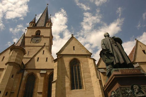 Construcția s-a ridicat în anul 1500 pe ruinele unei bazilici romanice. În ciuda faptului că reprezintă un lăcaș sfânt, ascunde un secret. Mihnea Vodă, fiul lui Vlad Țepeș, se odihnește aici. Placa funerară este vizibilă chiar în ferulă. Domnitorul a fost asasinat în fața bisericii pe când ieșea de la slujba de duminică. Este singurul român care a avut onoarea de a fi înhumat alături de marile personalităţi ale Sibiului medieval.