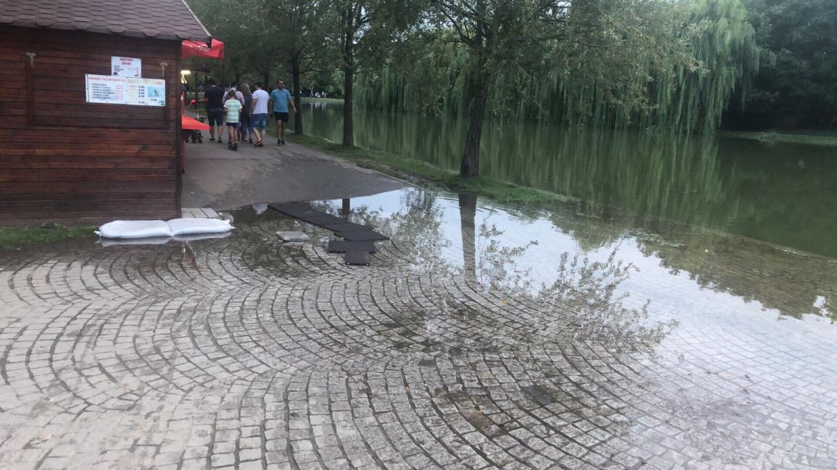 Imagini incredibile au fost surprinse, joi, în Parcul IOR, din București. În urma ploilor abundente, lacul și-a ieșit din matcă și a inundat aleile din parc.