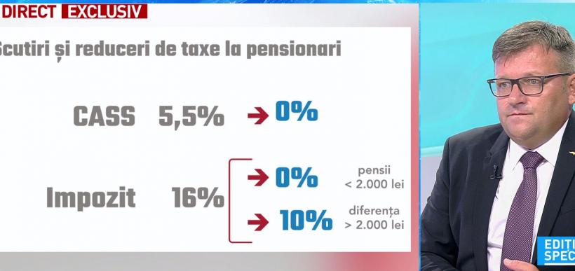 ”Am zis să intervenim la baza pensiilor, acolo unde pensiile sunt mici. Am redus pentru toată lumea contribuția de 5,5% ce reprezenta CASS, iar până la valoarea de 2.000 de lei nu se mai încasează impozit pe venit, iar ce se încasează peste 2.000 de lei pentru diferența respectivă a scăzut de la 16% la 10%”, a spus Marius Budăi.
