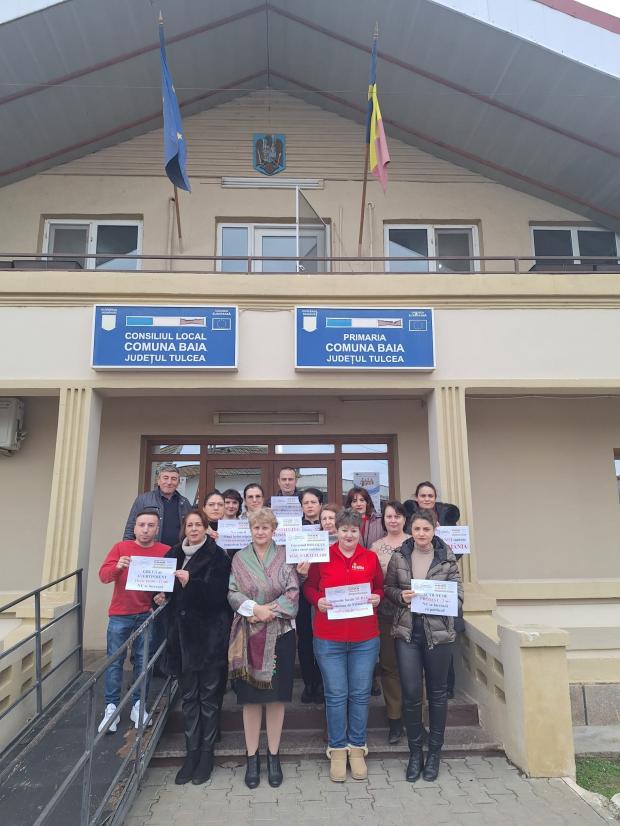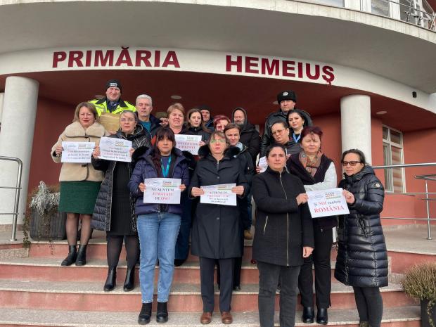 Angajații primăriei protestează față de disponibilizările planificate de Executiv, dar și față de grila salarială mai mică pentru funcționarii publici din comunele mai sărace, pe care o consideră discriminatorie.