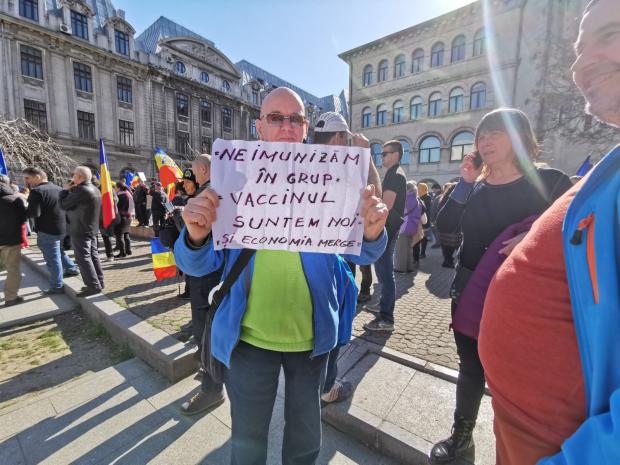 Îngrădirea drepturilor omului începe de la cea mai mică restricție. Fiecare trebuie să fie liber și să decidă cum se protejează. Acestă dictatura face din toată această 'plandemie' o dictatură ideologică. Se folosește de acest virus pentru a pune la pământ cu totul România", a mai spus un protestatar venit din ţară.
