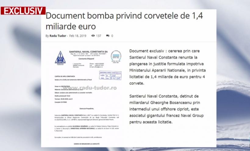 Radu Tudor prezintă pe blogul său un document exclusiv. Este vorba despre cererea prin care Santierul Naval Constanța renunță la plângerea în justiție formulată împotriva Ministerului Apărării Naționale, în privința licitației de 1,4 miliarde de euro pentru 4 corvete.