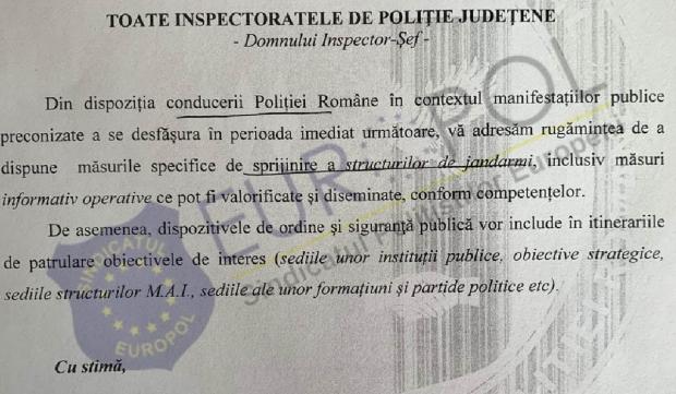 O adresă transmisă la nivelul tuturor județelor, transpune solicitarea conducerii MAI, de a culege informații pentru manifestațiile publice preconizate în perioada următoare.