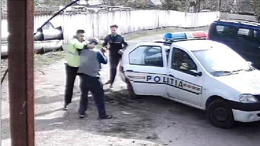 Douã camere de supraveghere au reusit sã surprindã corectia cruntã, la care este supus „inculpatul” de cãtre cei doi tineri politisti, care îl acuzã de ultraj.