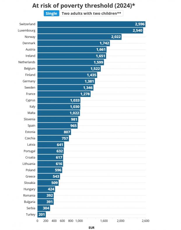 Cu toate acestea, cifrele la nivel de țară oferă o imagine mult mai clară. În UE, acest prag variază de la 391 EUR în Bulgaria sau 392 EUR în România, la 2.540 EUR în Luxemburg.