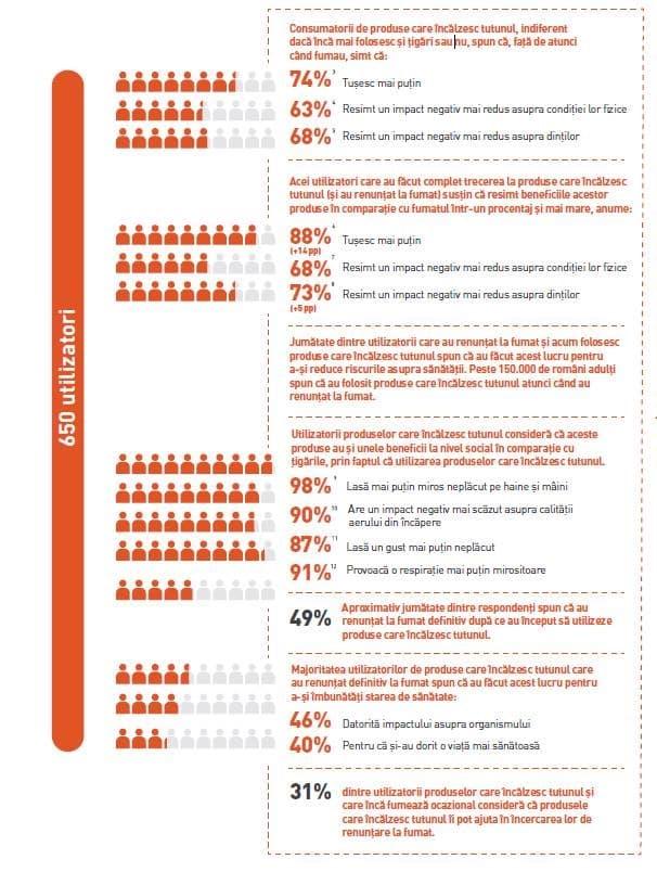 În cazul consumatorilor care au trecut la produse de încălzire a tutunului și au renunțat complet la fumat, diferențele sunt percepute de mai mulți dintre repondenți: 88% dintre repondenți susțin că tușesc mai puțin decât atunci când fumau și 68% spun că resimt un impact mai redus asupra condiției lor fizice. În plus, în cazul acestor consumatori, principalele motive pentru folosirea THP-urilor sunt satisfacția oferită de aceste produse și faptul că le pot folosi în jurul altor persoane fără a le deranja.