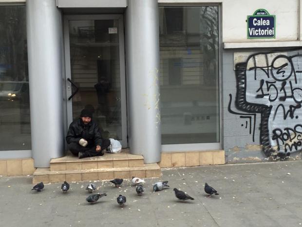 Într-o fotografie care circulă pe Facebook, apare un om al străzii, pe Calea Victoriei din Capitală, care dă să mănânce pâine porumbeilor.