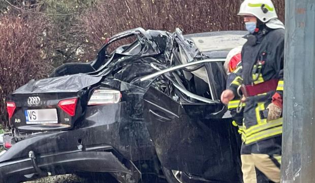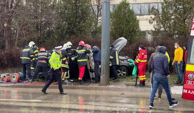 Maşina scăpată de sub control s-a izbit violent de un stâlp de troleu şi a rămas încolăcită în jurul stâlpului. În urma impactului, şoferul a rămas încarcerat în autoturism.