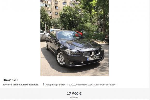 Bărbatul a postat un anunț de vânzare, pe un site de specialitate, în care cerea 17.900 de euro pentru mașina lui BMW Seria 5, scriu jurnaliștii gsp.ro.