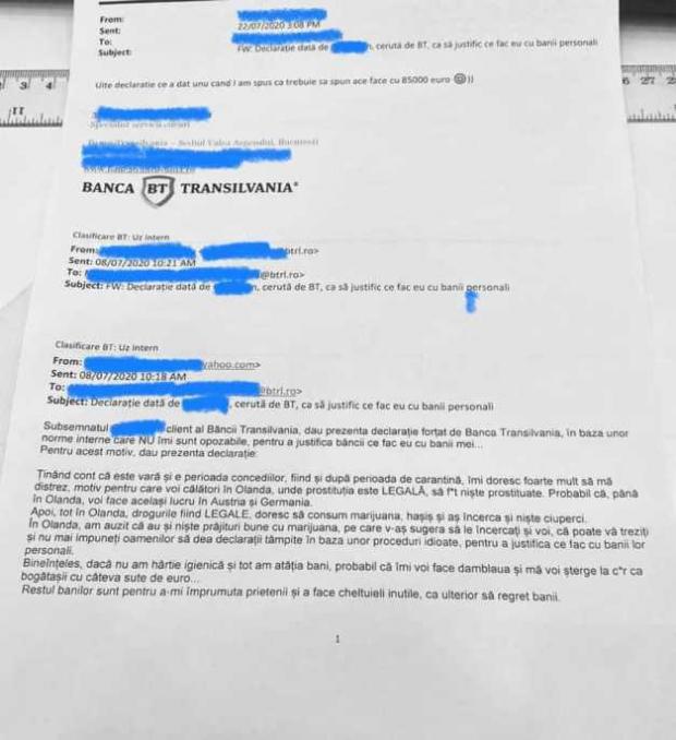 Românul a vrut să retragă 85.000 de mii de euro din contul său, însă Banca Transilvania a invocat un cadru normativ și a obligat clientul să justifice cum va cheltui acesta banii pe care îi va retrage.