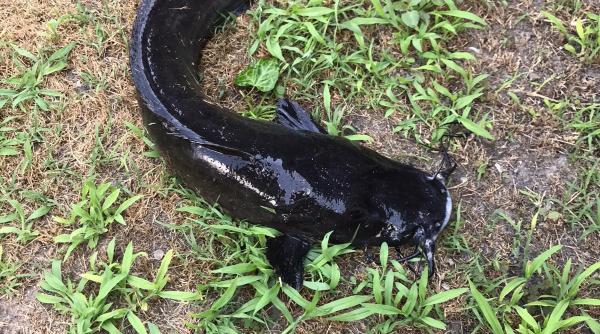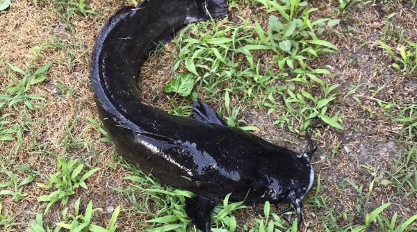 Eduard German, un pescar de 54 de ani , din comuna Crișan, a prins mai multe exemplare se somn african și este convins că peștele a scăpat din crescătorii.