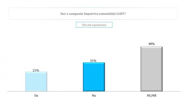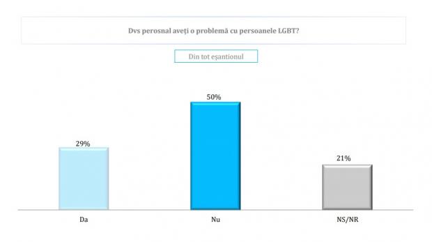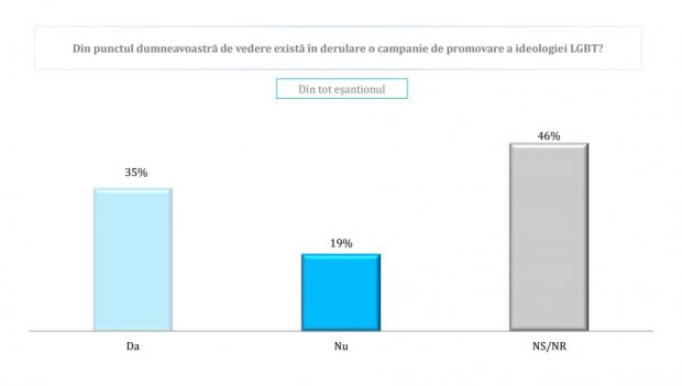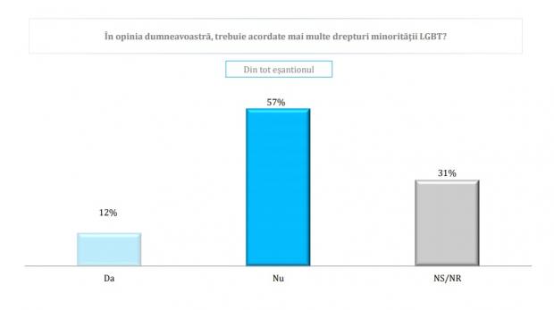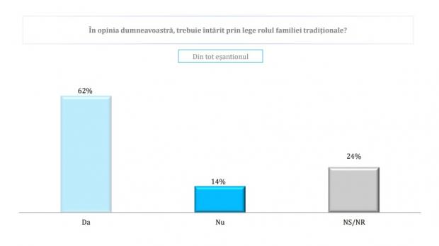 Astfel, doar 12% dintre români cred că ar trebui acordate mai multe drepturi comunității LGBT în timp ce 62% cred că trebuie întărit prin lege rolul familiei tradiționale.