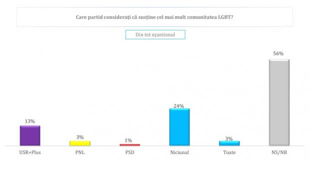 13% cred că USR PLUS, 3 % PNL și doar 1% PSD. 24% dintre respondenți sunt de părere că niciun partid nu susține comunitatea LGBT, 3% cred că toate iar 56% nu știu sau nu răspund.