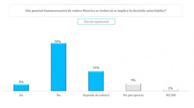 Doar 8% cred că ar trebui, în timp ce 58% cred că biserica nu ar trebui să se implice. 24% cred că depinde de subiect iar 9% nu pot aprecia.