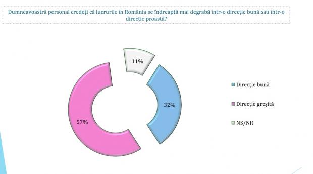 Totodată, 57% dintre persoanele intervievate au răspuns că țara se îndreaptă într-o direcție greșită și doar 32% sunt de părerere că direcția este corectă.