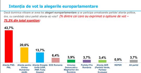 Pe primul loc în preferințele românilor se clasează alianța PSD-PNL, cu 43.7%. Pe locul al doilea se clasează AUR, cu 20.6% din voturi.