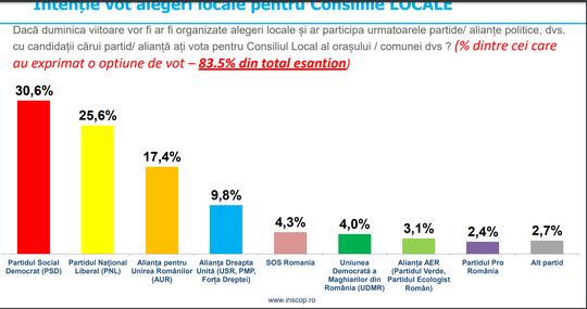 La alegerile locale, în schimb, pe primul loc în preferințele românilor se clasează PSD, cu 30.6%, urmat de PNL, cu 25.6% și AUR, cu 17.4%.