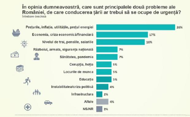 Principalele probleme de care conducerea țării ar trebui să se ocupe de urgență sunt prețurile, criza economică, pensiile și salariile.