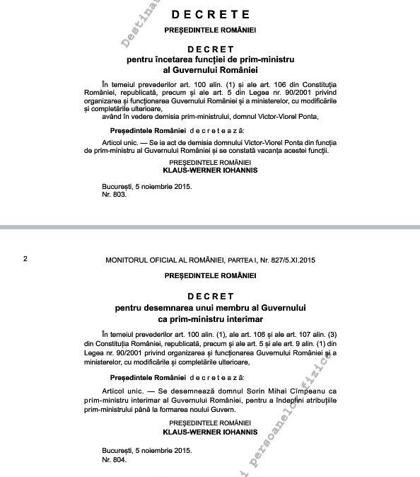 "Am acceptat demisia premierului Victor Ponta. Am decis astăzi să îl numesc în poziţia de premier interimar pe ministrul Sorin Cîmpeanu", a anunţat preşedintele Klaus Iohannis.