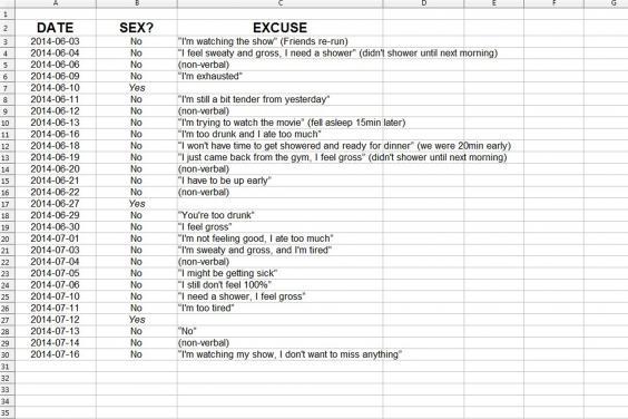Conform independent.co.uk, femeia i-ar fi spus bărbatului că nu vrea să facă sex cu el pentru că "se scoală devreme", "eşti prea beat", "sunt ruptă de oboseală". El i-a propus să facă sex de 27 de ori în cele două luni, dar s-a culcat cu ea de trei ori.