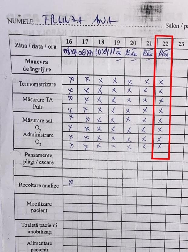 Surprinzător este că în dosarul medical apare că pacientei i s-a verificat pulsul, nivelul oxigenului şi temperatura, asta deşi murise de o zi.